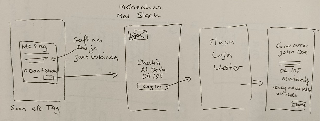 In de wireframe ga je van de NFC pop-up van je telefoon door naar de inlog pagina waar je te zien krijgt op welk bureau je wilt gaan inchecken. Vervolgens ga je naar het Slack login systeem. Als je bent ingelogd kan je je status (available, busy of hidden) aangeven en inchecken. Er zijn een aantal schermen in dit proces waar ik geen invloed op heb zoals de pop-up van de telefoon wanneer je NFC scanned of het Slack inlog scherm.